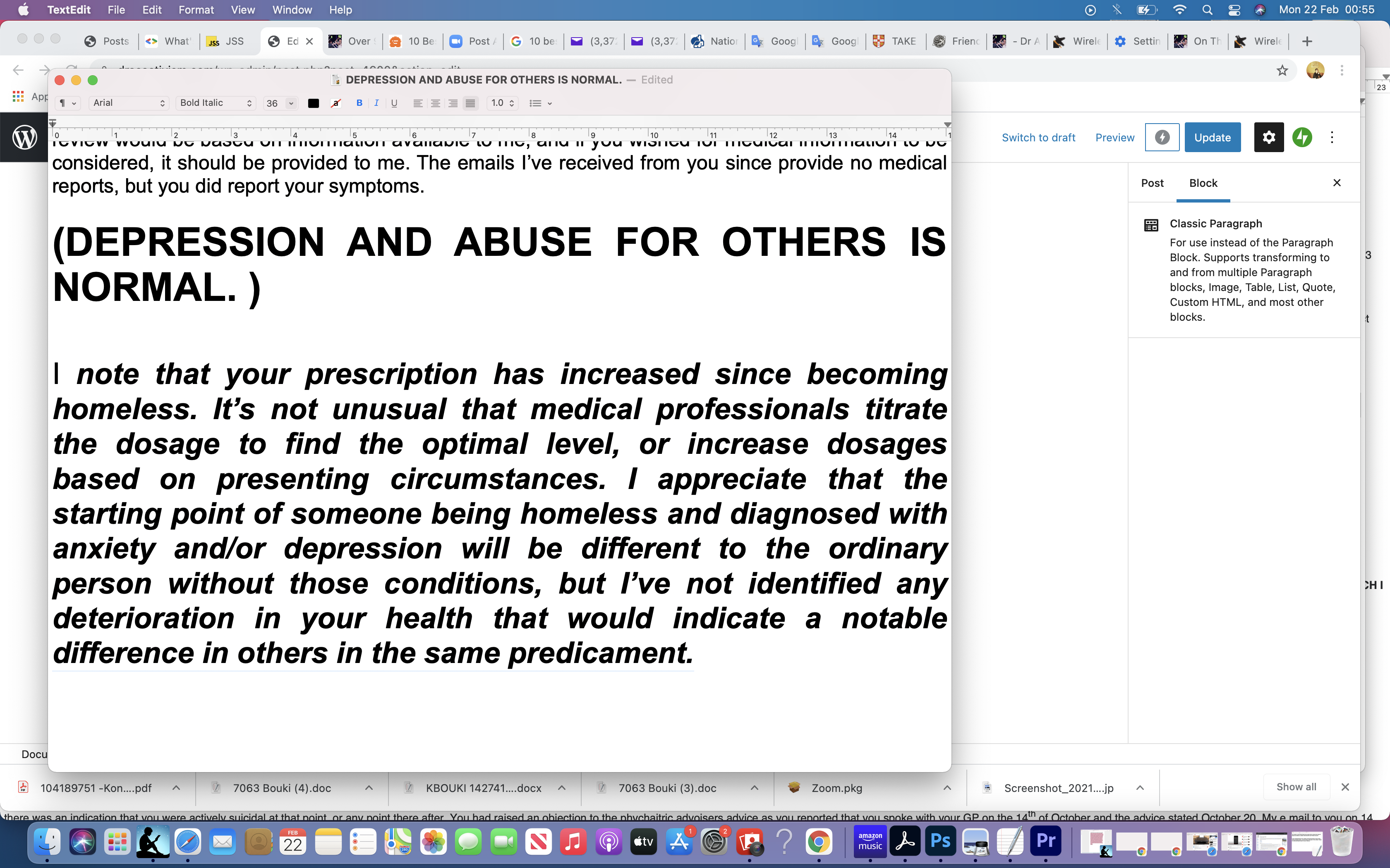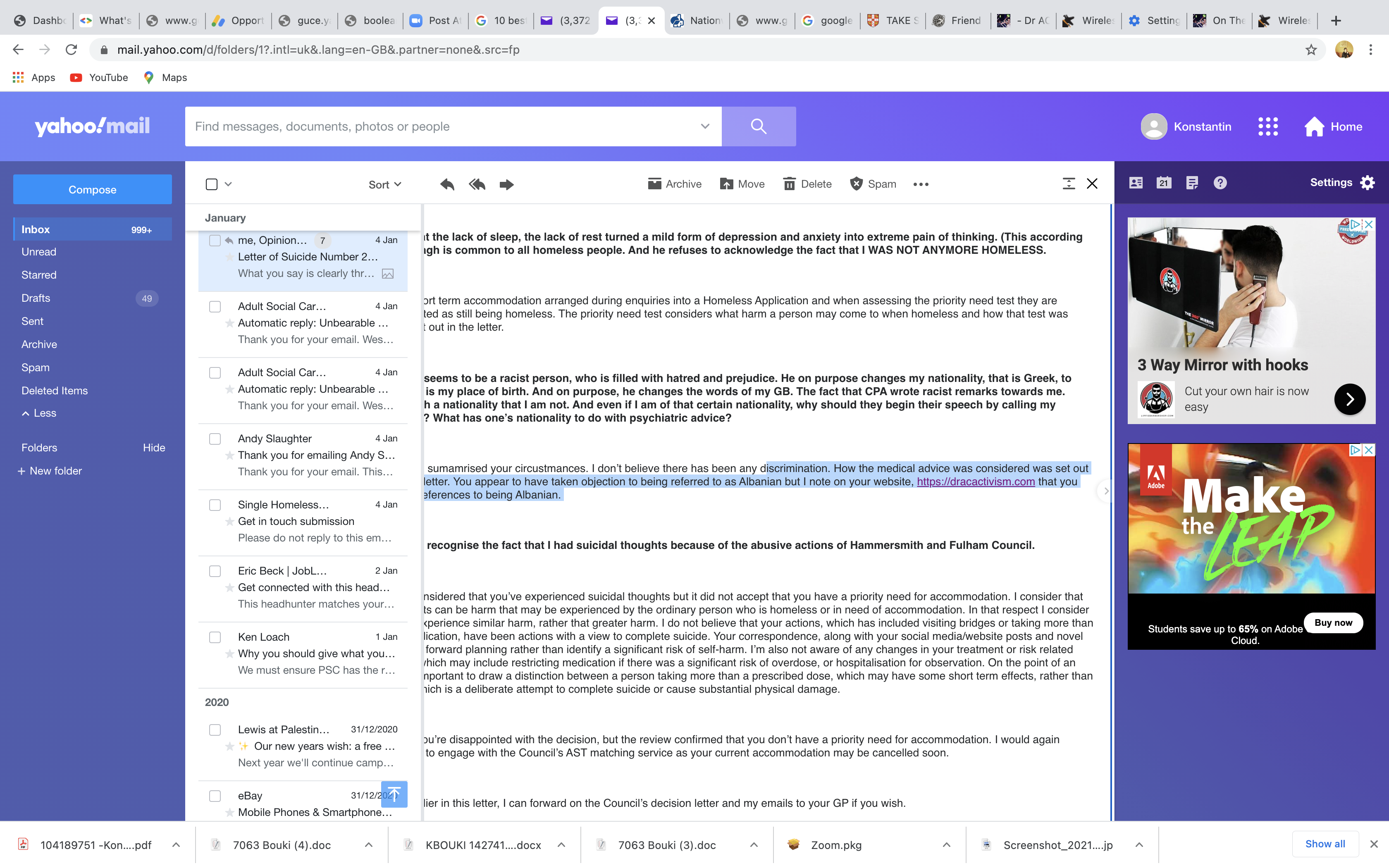 Now, a day before being thrown outside or evicted, and during that day 9th of Oct 2020, I experienced suicidal feelings. And I took too many anti depressants to calm down my depressive moods. And so, I passed out in the street. Then, I made a candid note of the pain and of the feelings that I was going through and I wrote them to the people of the council. And told them to look at my rights and to look at our laws. And see whether they have broken the laws by using me in this horrible and anti human way.