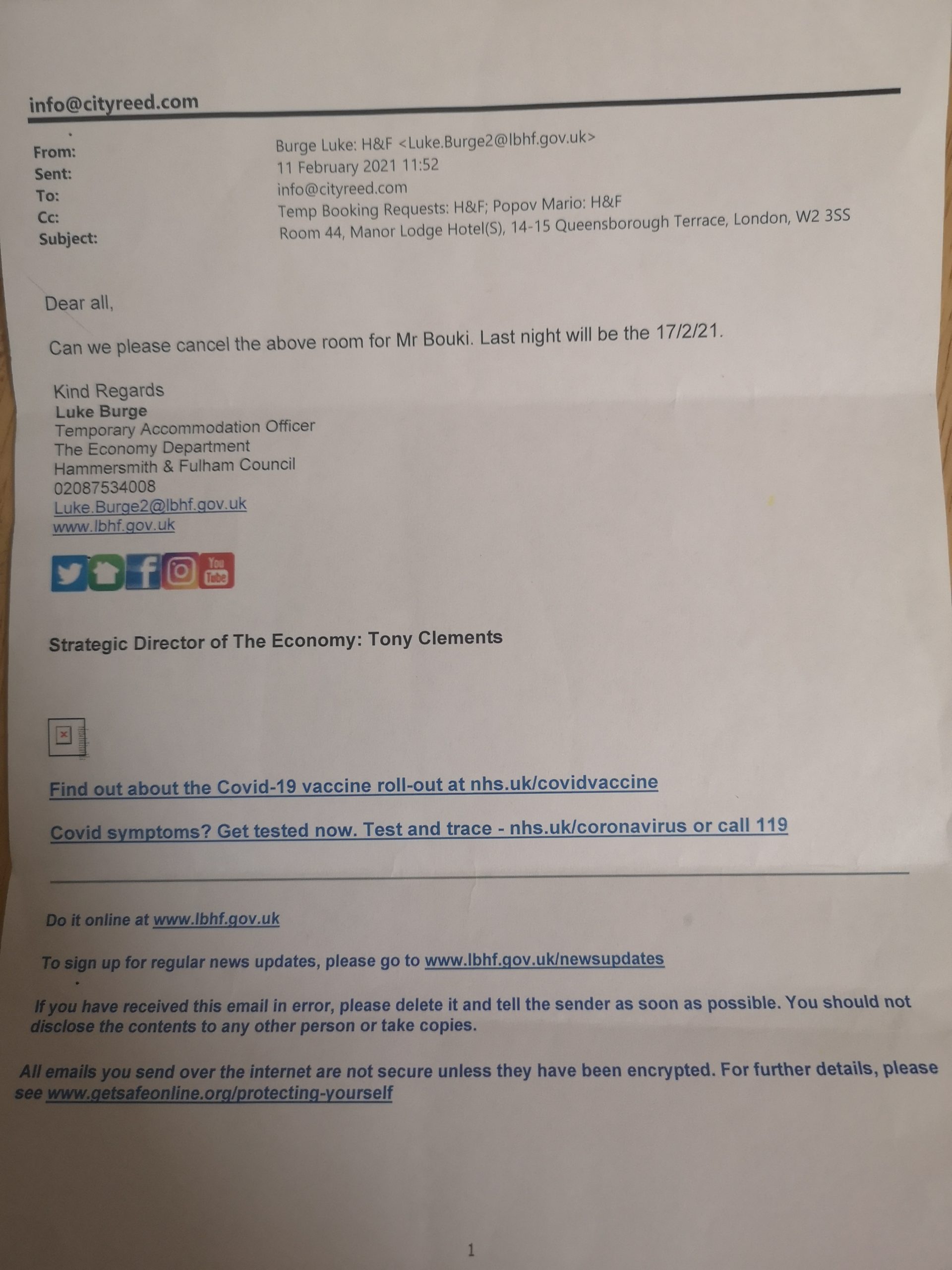 Now, on 11th February 2021, Hammersmith and Fulham Council sent a letter of cancellation of my accommodation one more time. And on 18th of Feb 2021, they sent another extension of my accommodation. And another cancellation.