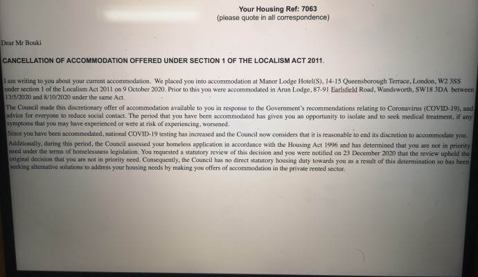 The Letter of Eviction of Hammersmith and Fulham council are a threat with a knife or a gun towards me and towards anyone in as such condition.